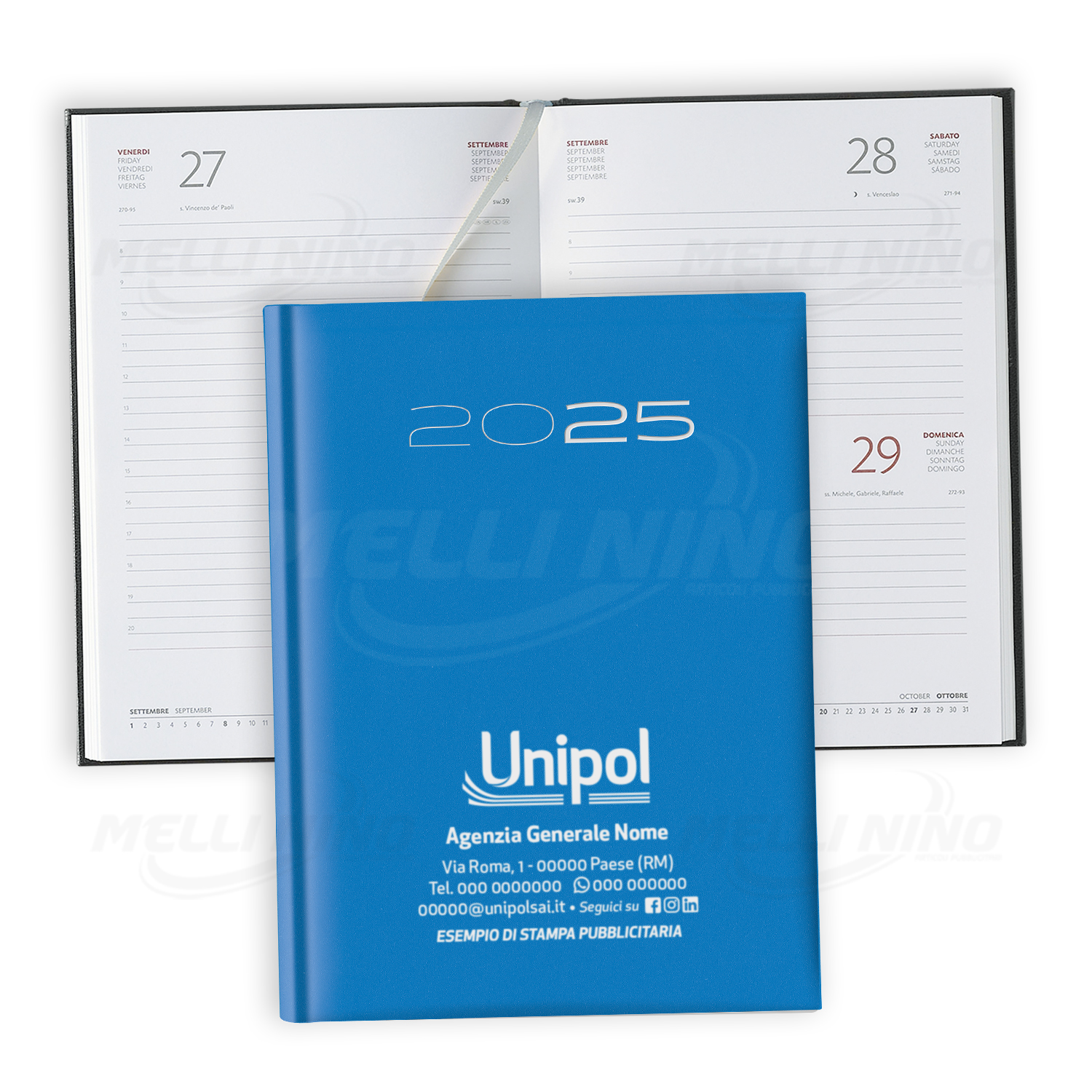 Agenda Giornaliera, dimensione 15×21 cm. circa, ordinabile con solo logo Unipol sulla copertina o personalizzabile con la propria grafica, ad un colore, a partire da 30 pezzi. Interno Multilingue stampato a 2 colori con sabato e domenica abbinati, rubrica telefonica, cartina geografica, festività nel mondo. Fornita senza astuccio (ordinabile a parte).