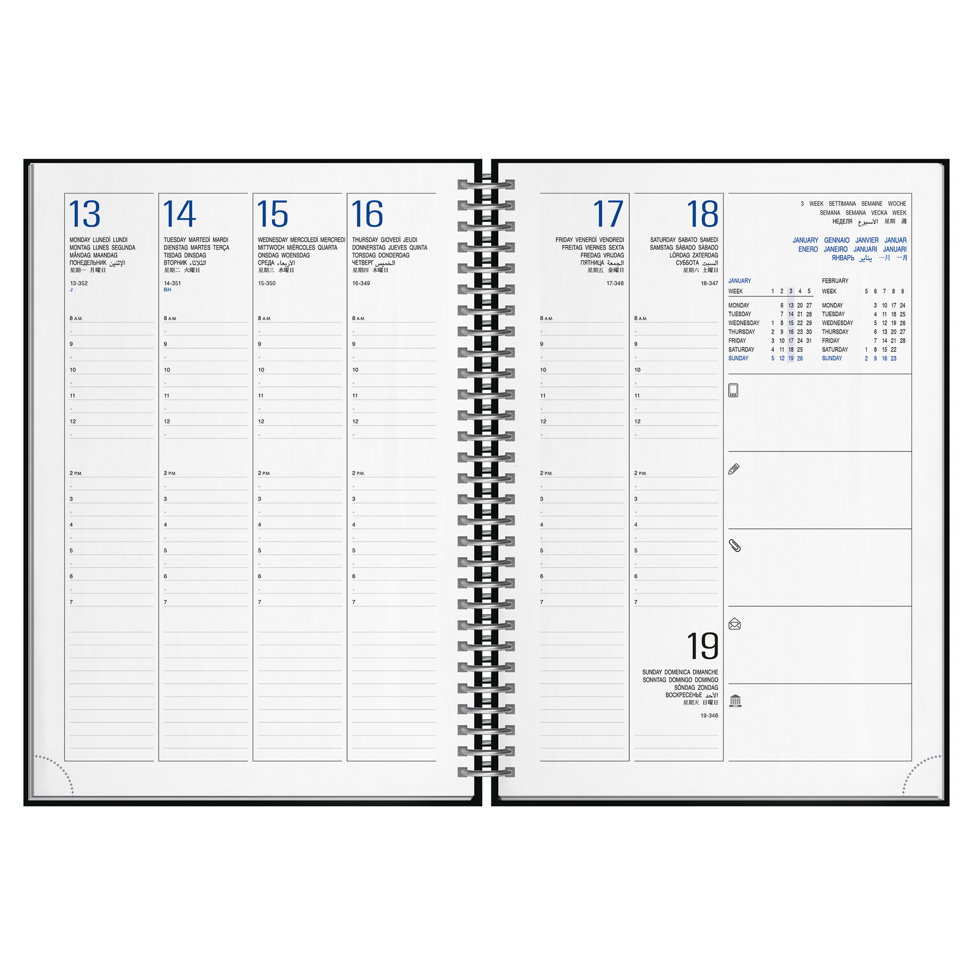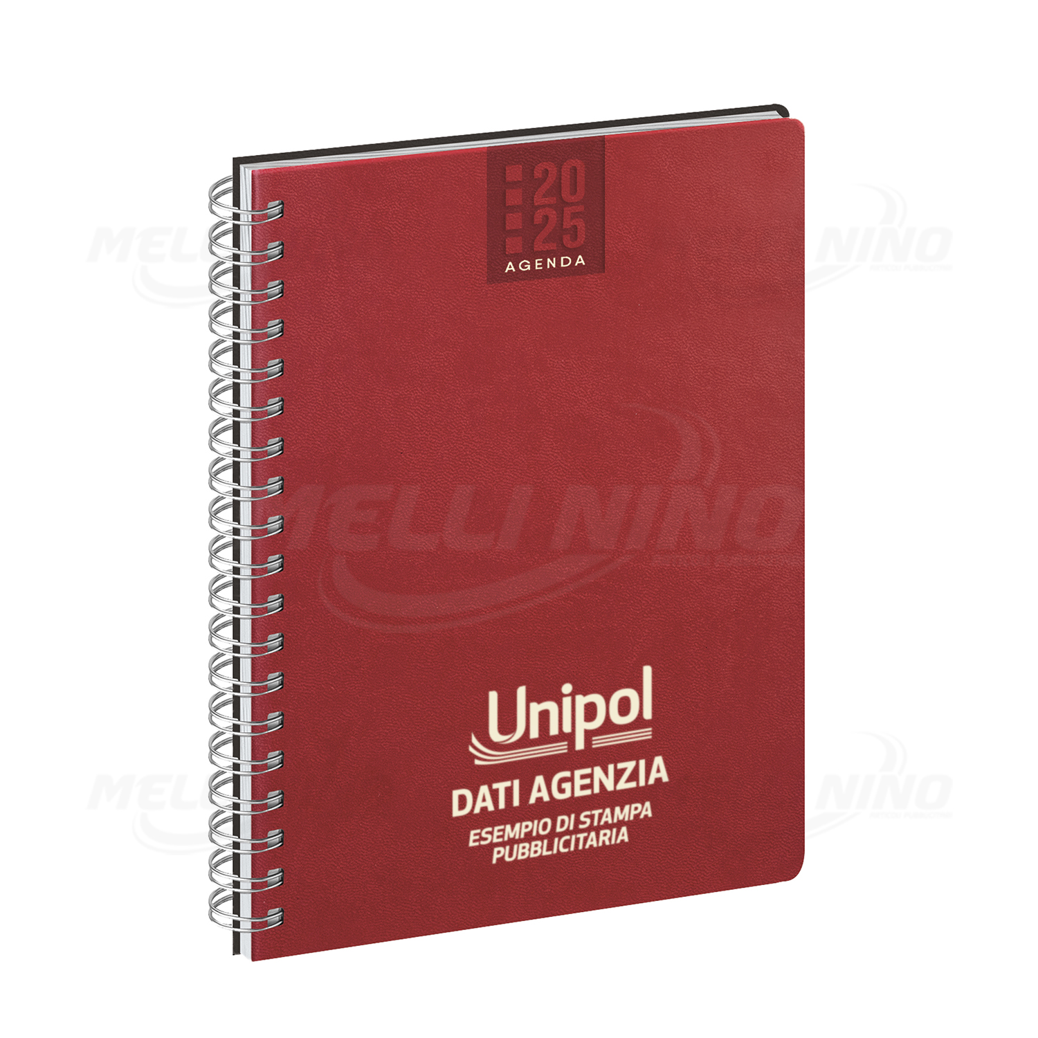 Agenda Settimanale “Spirale” personalizzata, di produzione italiana con interno stampato a 2 colori su carta bianca, edizione multilingue con rubrica e inserto cartografico. Esterno in poliuretano termovirante.