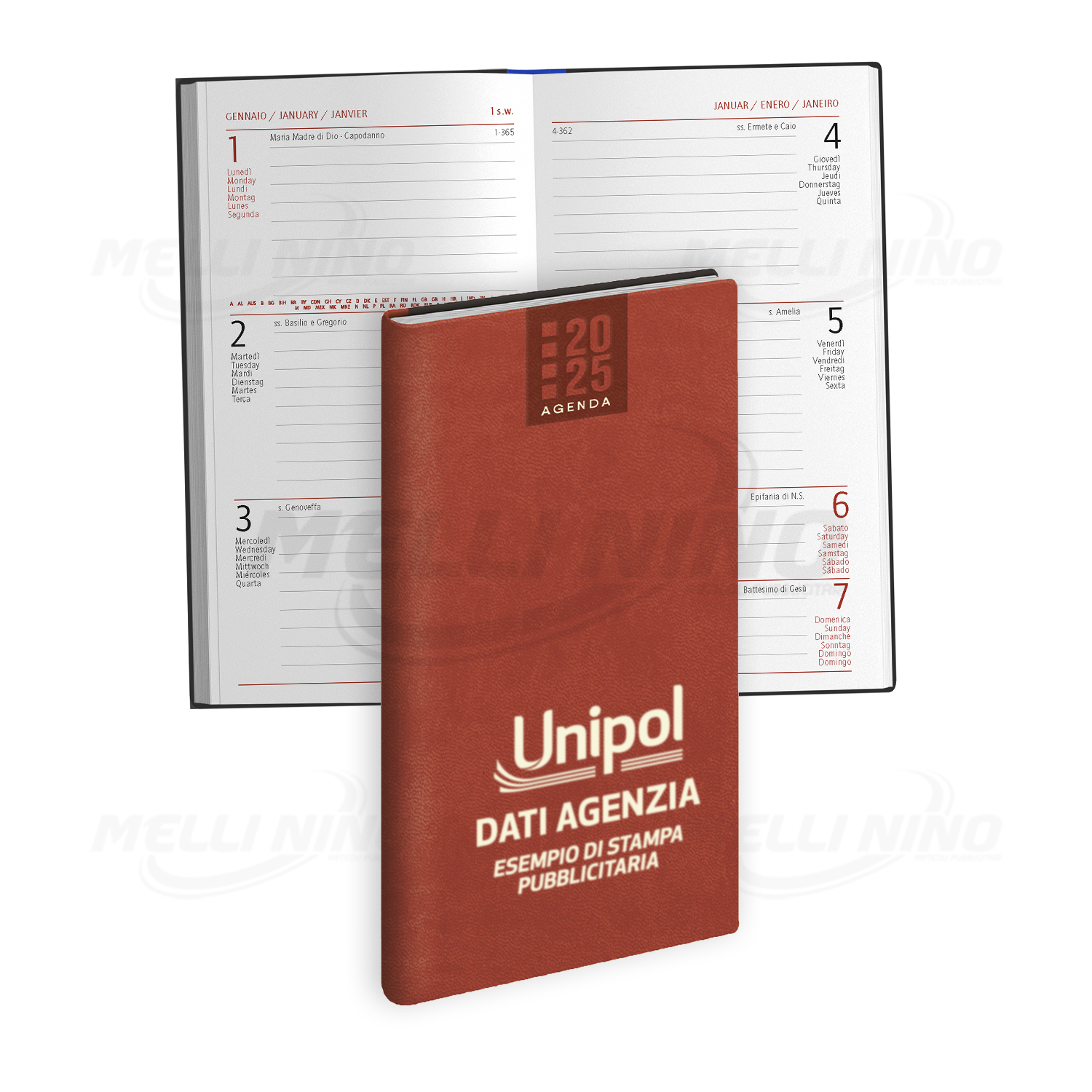 Agendina Tascabile Settimanale “Printflex”, con copertina in poliuretano flessibile termovirante, dimensione 9×15 cm. circa, ordinabile con solo logo Unipol sulla copertina o personalizzabile con la propria grafica, ad un colore, a partire da 30 pezzi. Interno Multilingue stampato a 2 colori con sabato e domenica abbinati, rubrica telefonica, cartina geografica, festività nel mondo. Fornita senza astuccio (ordinabile a parte).