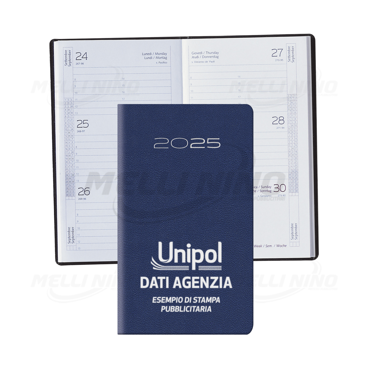 Agendina Settimanale Tascabile, dimensione 8×14 cm. circa, ordinabile con solo logo Unipol sulla copertina o personalizzabile con la propria grafica, ad un colore, a partire da 30 pezzi. Interno Multilingue stampato a 2 colori con sabato e domenica abbinati, rubrica telefonica, cartina geografica, festività nel mondo. Fornita senza astuccio (ordinabile a parte).