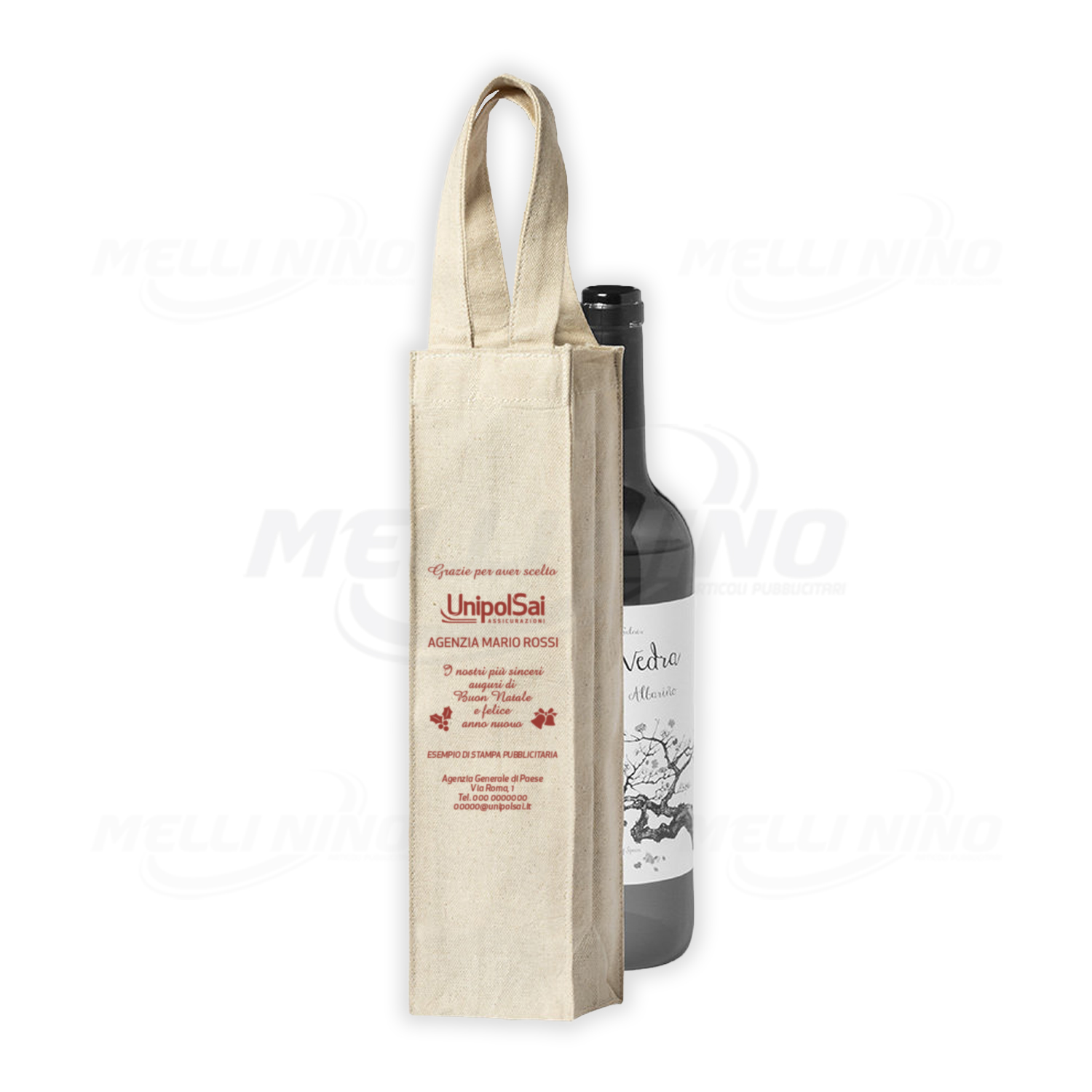 Borsa Portabottiglie Vino personalizzata, in tela 220 gr/m2. Cuciture e manici rinforzati. Dimensioni 8x31x8 cm.