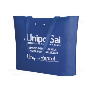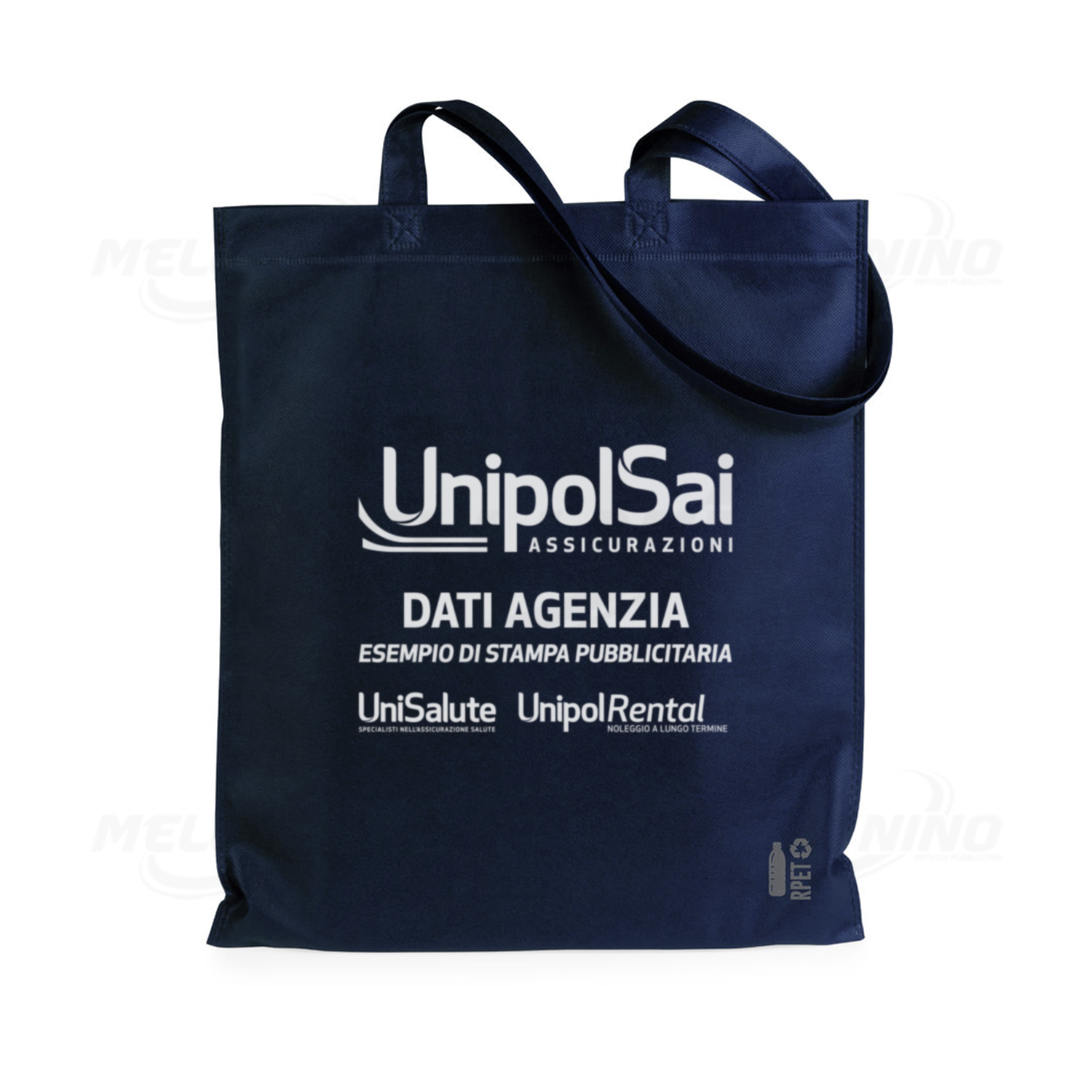 Borsa “rPet” personalizzata, finiture termosaldate e manici lunghi rinforzati. Marchio rpet prestampato. Resistenza fino a 5kg di peso. Dimensioni: 36×40 cm