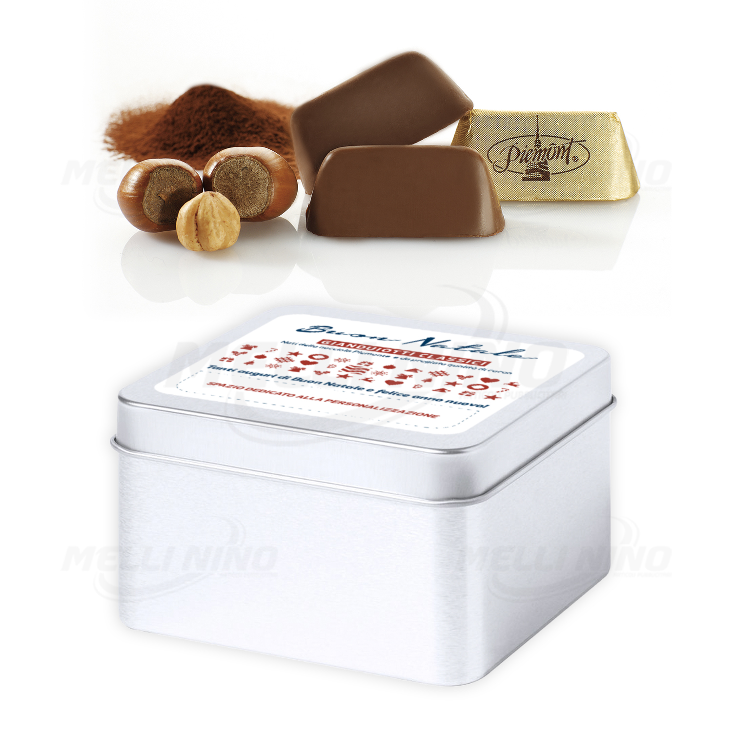 Box di Gianduiotti Classici: nati dalla nocciola Piemonte IGP e da pregiata qualità di cacao, confezione da 100 gr acquistabile con etichetta generica Unipol o personalizzabile con messaggi di auguri, logo personale, loghi istituzionali (UnipolSai, UnipolRental, UniSalute, UnipolMove, ecc…), contatti (indirizzo, telefono, email, ecc…) e qualsiasi grafica realizzata secondo le Vostre esigenze! Box in metallo 9x9x5 cm. che può essere riutilizzata a piacimento come svuota tasche, portapenne, vaso, ecc…