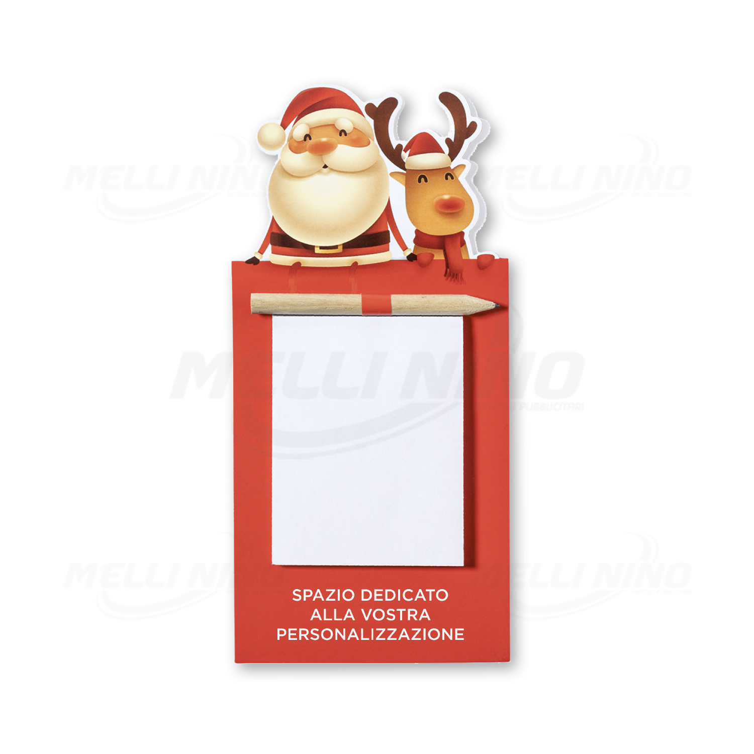 Calamita “Larry” personalizzata, con block notes da 40 fogli e matita su una simpatica base natalizia con Babbo Natale e la Renna
