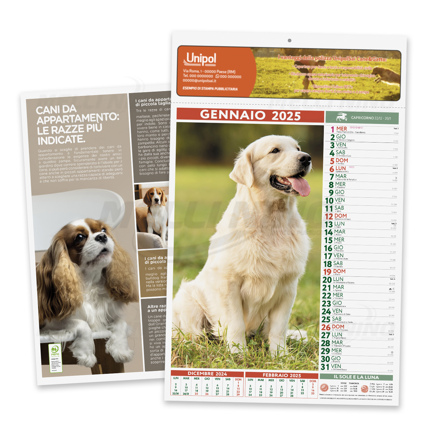 Calendario Olandese Illustrato “Cani e Gatti” personalizzato, Dimensione cm. 29×47 ca. – Composto da 12 fogli in carta patinata, sul retro utili consigli per il benessere dei nostri amici a 4 zampe!