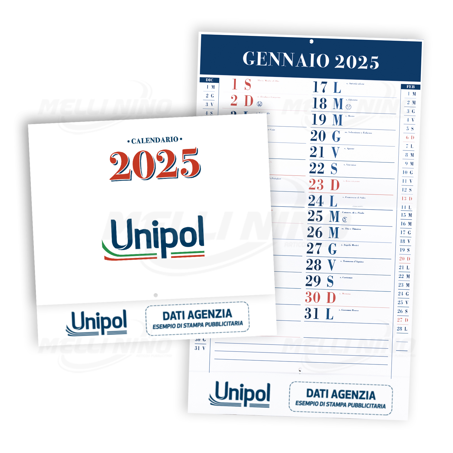 Calendario Olandese Istituzionale, Dimensione cm. 29×44 ca. – Composto da 6 fogli in carta Bianca, confezionato con due punti metallici. Disponibile con Copertina con logo Unipol a colori o personalizzabile con logo personale a un colore.