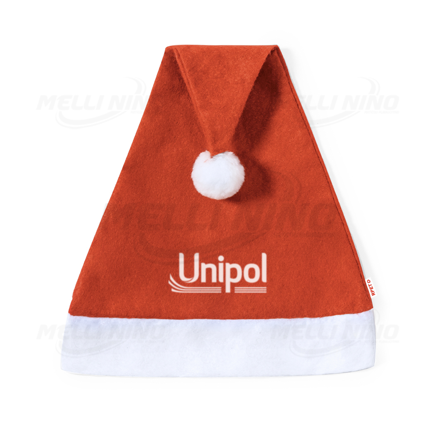 Cappellino Babbo Natale ecologico, realizzato in rPet, ordinabile con solo logo Unipol o personalizzabile con la propria grafica a partire da 30 pezzi.