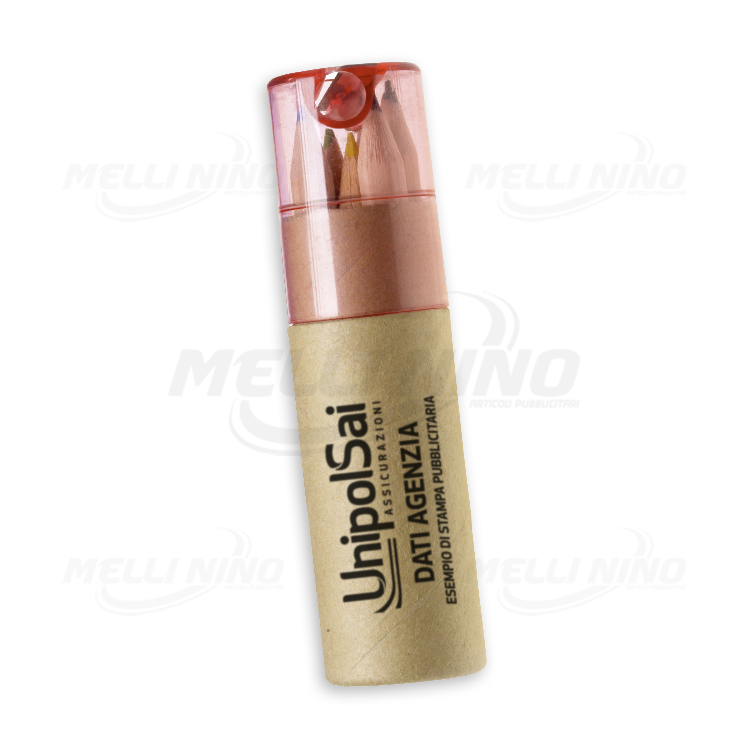 Set Matite Colorate personalizzato, un ottimo omaggio economico per i bambini composto da una confezione cilindrica in cartone riciclato, coperchio in Abs colorato con temperamatite e 6 matitine colorate. Dimensione cm. 10,5 x 2,5 ca.