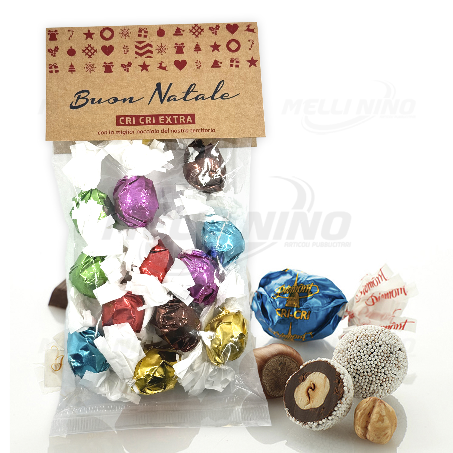 Tradizionali Cri Cri Torinesi: una nocciola Piemonte IGP viene prima tostata poi ricoperta di finissimo cioccolato fondente 60% e rifinita con mompariglia di zucchero, confezione da 100gr acquistabile con etichetta generica Unipol o personalizzabile, in cartoncino svedese 225 gr/mq stampato a colori. Personalizzabile con messaggi di auguri, logo personale, loghi istituzionali (UnipolSai, UnipolRental, UniSalute, UnipolMove, ecc…), contatti (indirizzo, telefono, email, ecc…) e qualsiasi grafica realizzata secondo le Vostre esigenze!