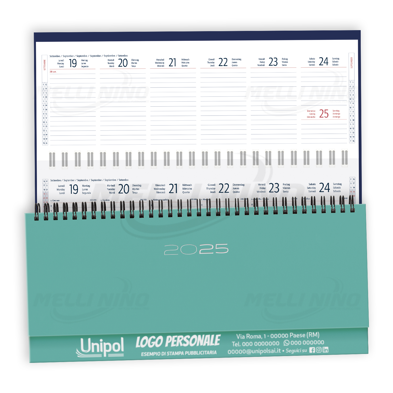 Planning Settimanale Spiralato, dimensione 30×15 cm. circa, ordinabile con solo logo Unipol sulla copertina o personalizzabile con la propria grafica, ad un colore, a partire da 30 pezzi. Interno Multilingue stampato a 2 colori con sabato e domenica abbinati, rubrica telefonica, cartina geografica, festività nel mondo. Fornita senza astuccio (ordinabile a parte).