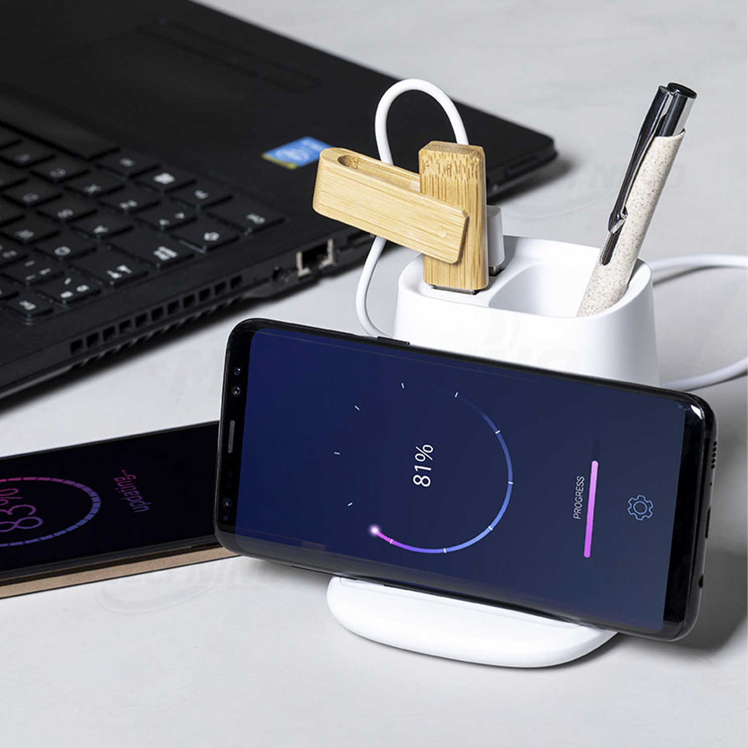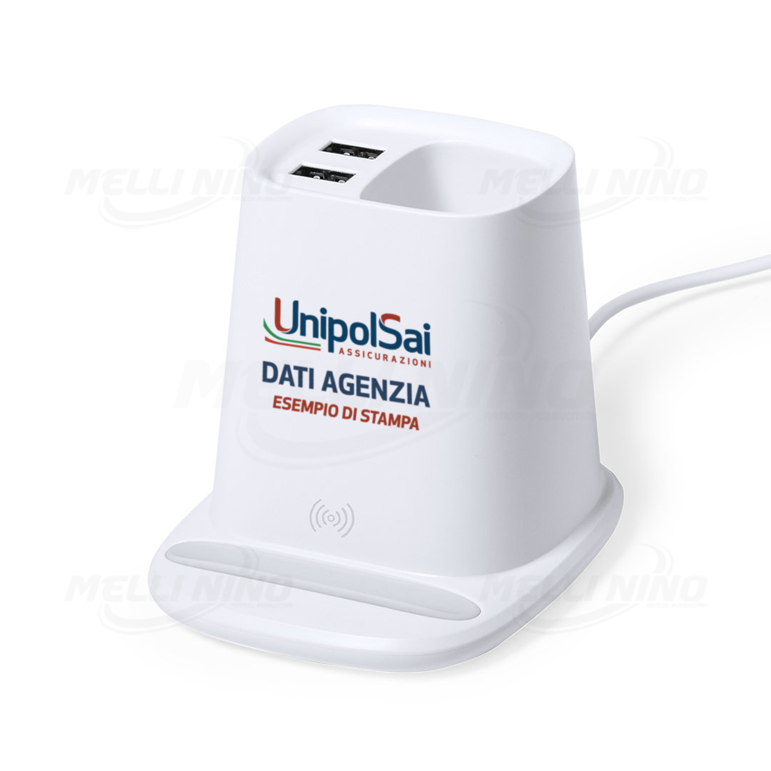 Portapenne “High Tech” personalizzato, multifunzione 4 in 1. Con funzioni di portapenne, supporto per smartphone, caricabatterie wireless 5W (occorre tenere il telefono in orizzontale come da foto) e 2 uscite USB 2000 mA. Porta USB inferiore, adatta per il trasferimento dei dati. Compatibile con gli smartphone con tecnologia di ricarica senza fili. Include un cavo di tipo C lungo 1 metro.