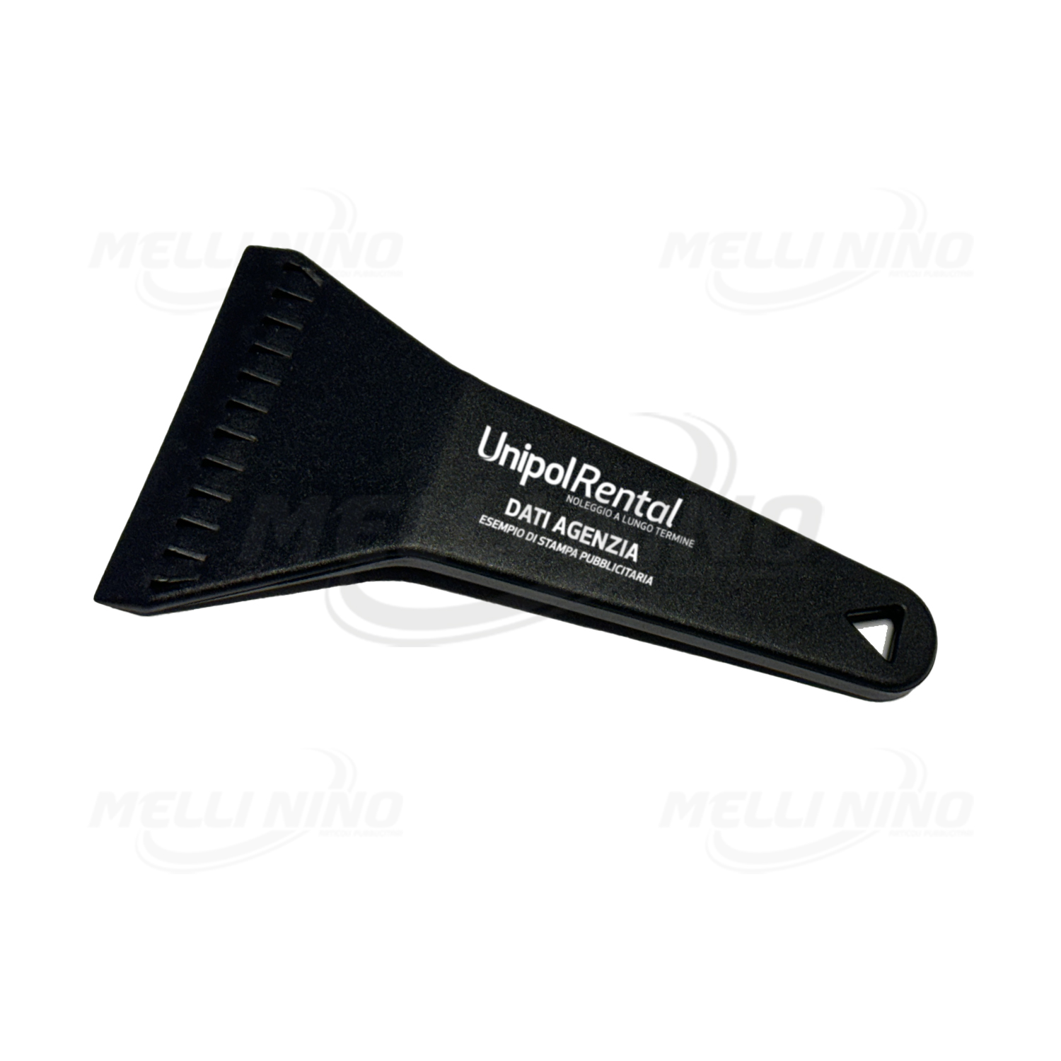 Raschiaghiaccio personalizzato, realizzato in polipropilene, grazie al manico è possibile applicare la pressione necessaria a sbrinare subito il parabrezza auto. Prodotto in Italia.