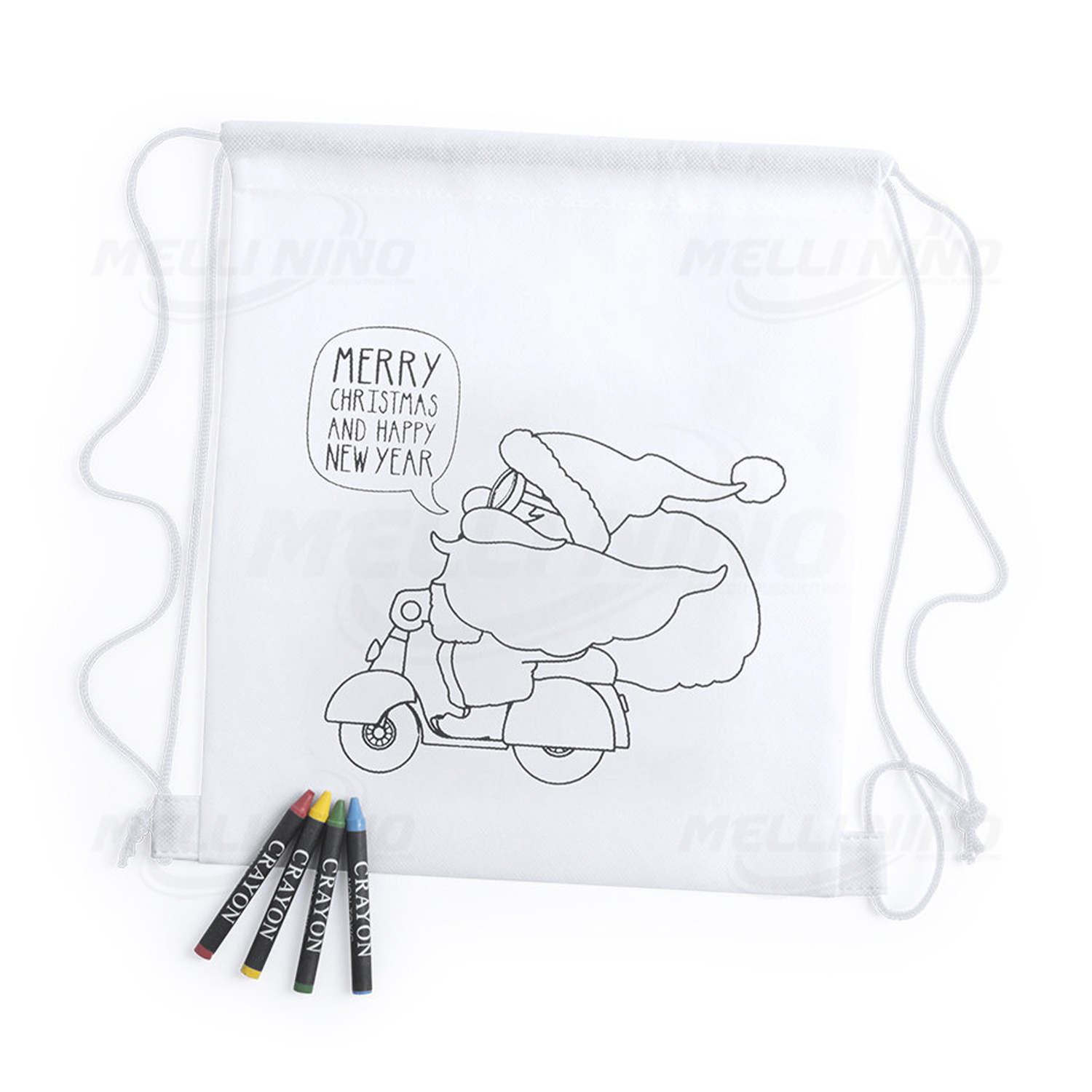 Sacca da colorare “Santa” personalizzata, in TNT con una simpatica stampa di Babbo Natale da colorare. Set di Pastelli a cera inclusi!