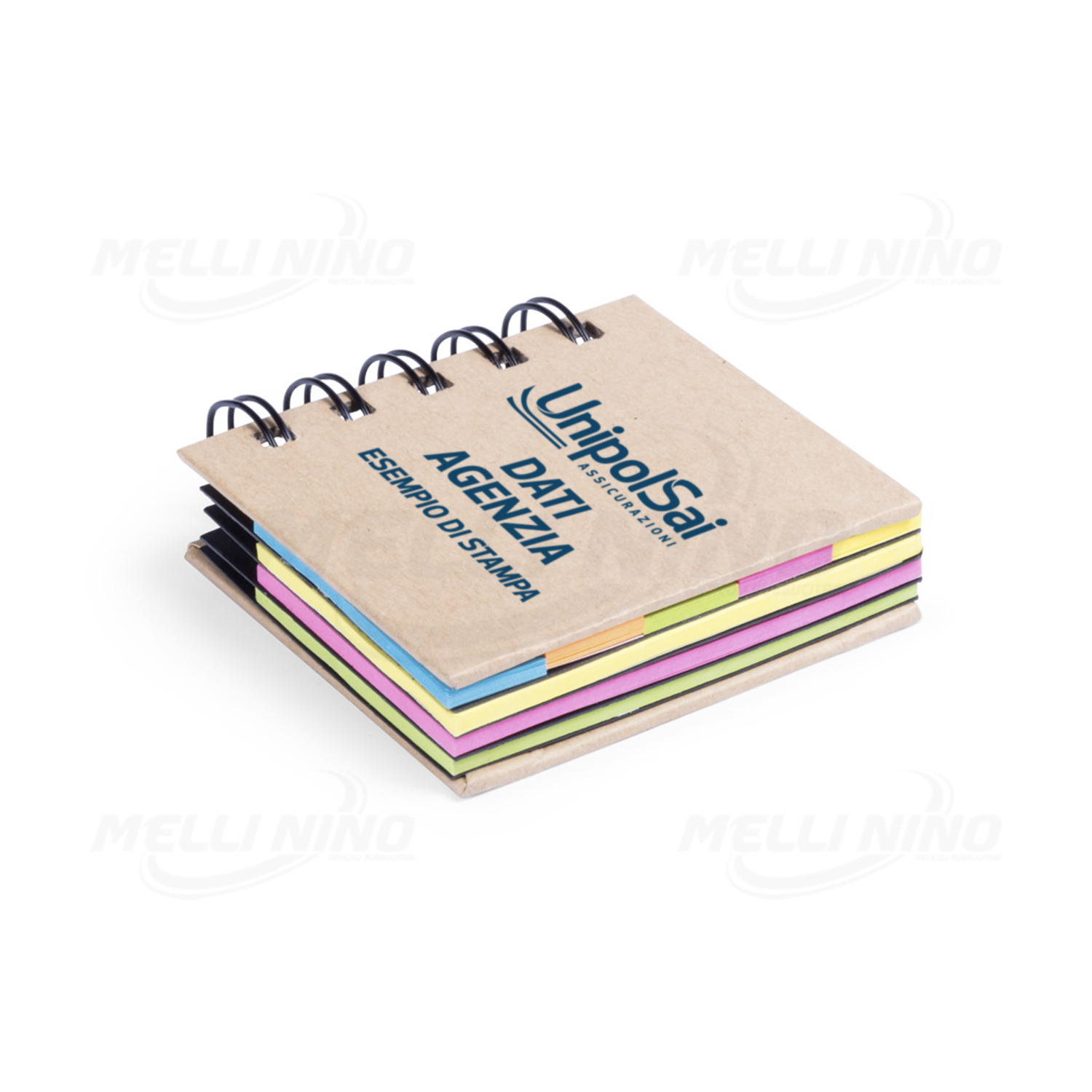 Set Memo “Laska” personalizzato, composto da 75 note adesive 5×7,5 cm e 125 mini note 1,5×5 cm. con copertina in cartoncino riciclato. Dimensione cm. 8,3×7,6×2,2